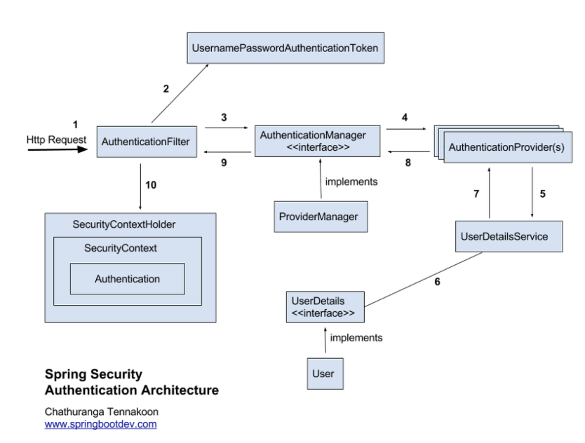 결과적으로 위의 흐름은 아래의 Spring Security 인증 아키텍처와 동일하다.