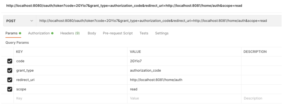 아래처럼 code뒤에 권한코드를 받습니다.(원래는 클라이언트가 받아서 전달 합니다.)