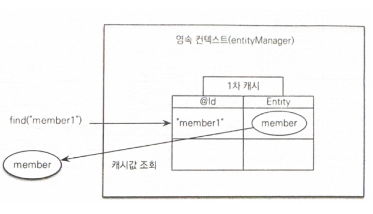 메모리에 있는 1차 캐시에서 엔티티를 조회 합니다.(@id로 매핑한 식별자가 key값)