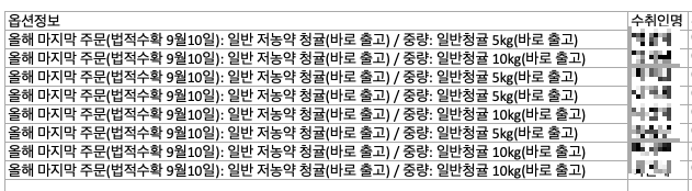아래는 네이버스토어에서 다운받은 신규주문 엑셀!