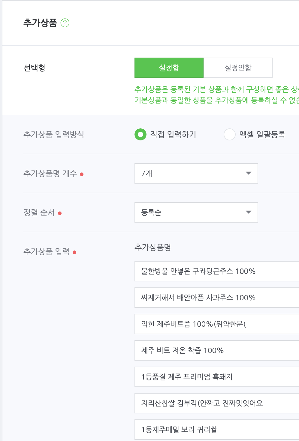 아래와 같이 기존 파는 상품에 대한 데이터가 옵션 데이터! 그리고 추가상품이다.