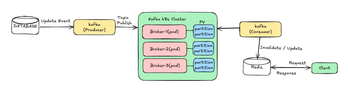 - DB에서 데이터가 바뀌면 Kafka 같은 메시지 브로커로 이벤트를 발행 → 캐시에서 해당 키만 삭제/갱신