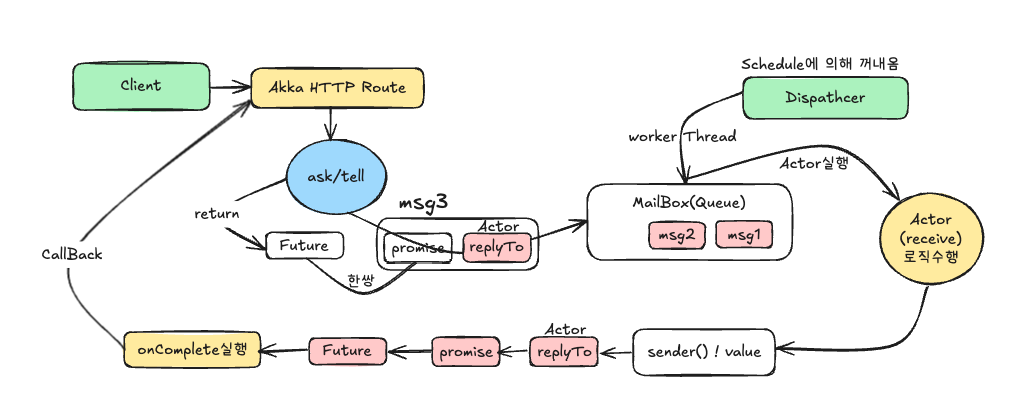 - 즉, Dispatcher가 메시지를 꺼내 액터의 receive를 실행 → 액터 로직이 끝나면 sender() ! value
