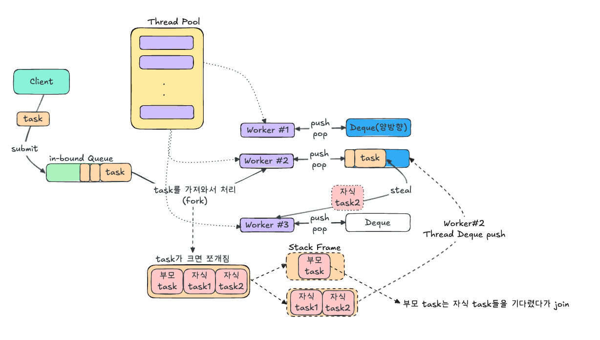- 해당 task를 Worker #2 쓰레드가 가져와서 fork를 합니다.