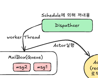 - Dispatcher : MailBox(Queue)에서 메시지를 꺼내고 Actor 실행을 스케줄링 합니다.