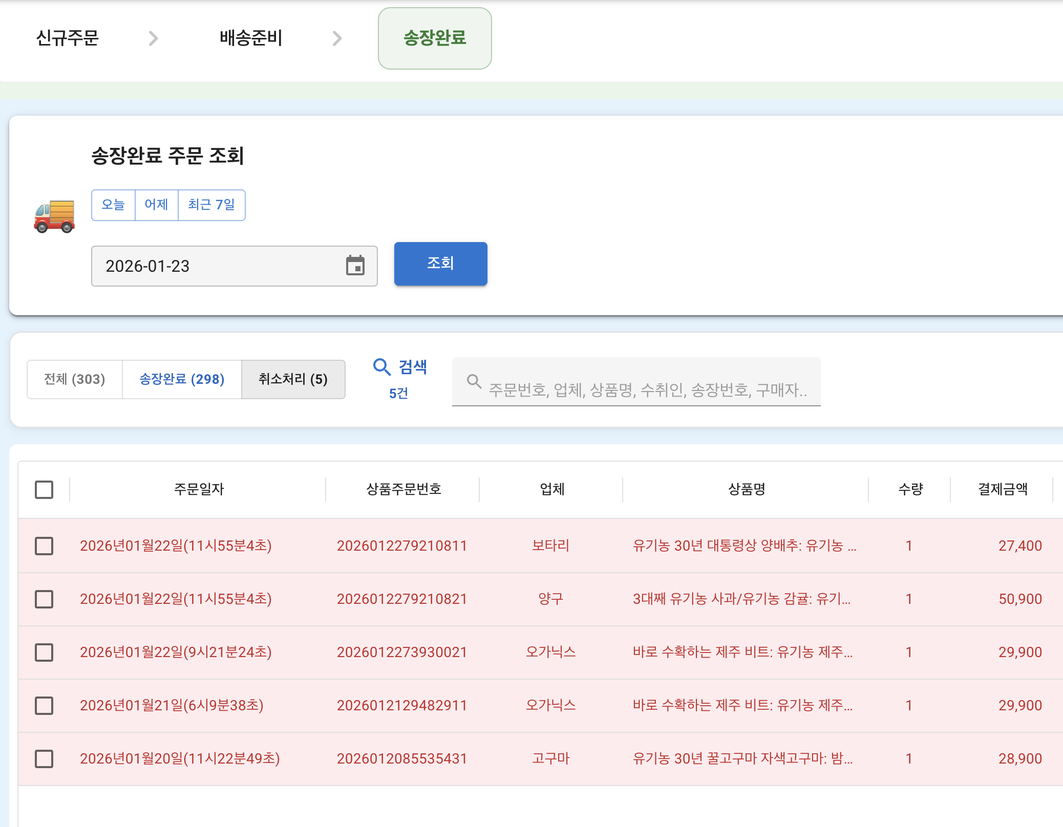 확인은 송장완료탭에서 확인이 가능하다.