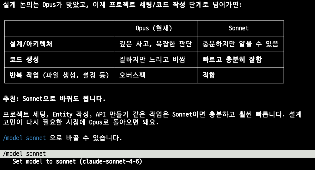물어보고 sonnet으로 모델 변경!
