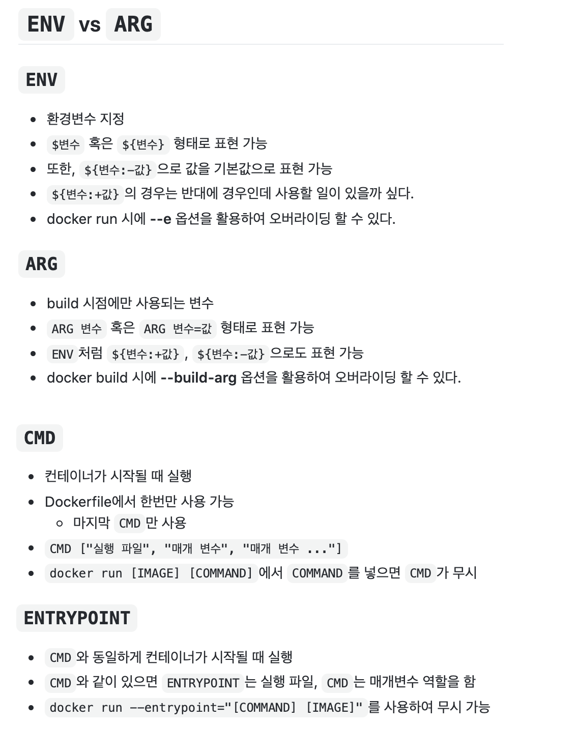 * ENV : 이미지에서 사용할 환경 변수 값을 지정한다. 위 코드는 PROFILE 환경 변수의 값으로 local을 지정했는데 이 경우 컨테이너를 생성할 때 PROFILE 환경 변수를 따로 지정하지 않으면 local을 기본 값으로 사용한다.