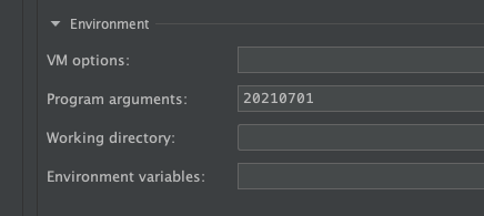 내가 하고 싶은 것은 아래와같이 argument에 날짜를 넣고 그것을 메인쪽에 있는 String[] args에서 받아서 처리하는 것이다.