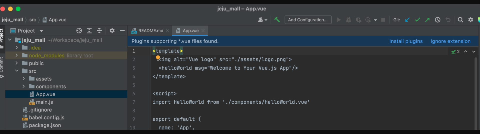 - src 디렉토리 밑에 있는 App.vue를 눌러보면 인텔리J에서 플러그인을 셋팅하라고 권고 해줍니다.