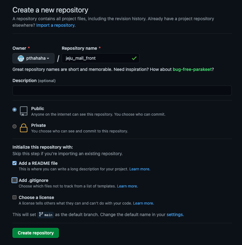 - 레파지토리명은 jeju_mall로 하도록 하겠습니다.