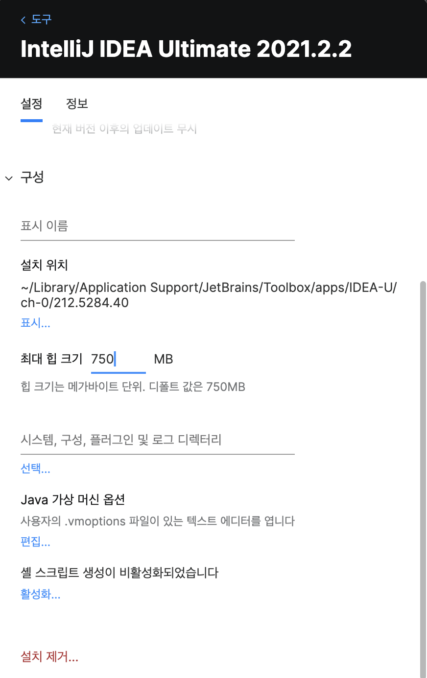 아래처럼 heap size도 조절이 가능하며 (메모리 기준 8G 1024~2048, 16G 2048~4096으로 셋팅)