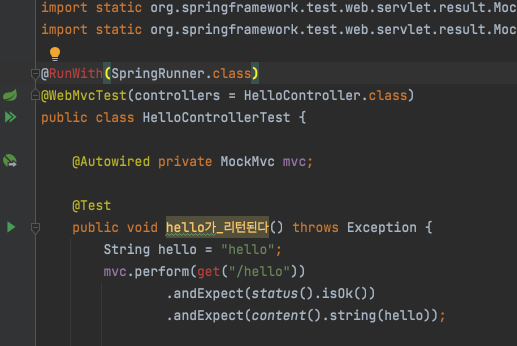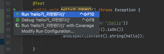 테스트코드에서 String hello = "hello!"; 이렇게 수정하고 다시 돌려보겠습니다.