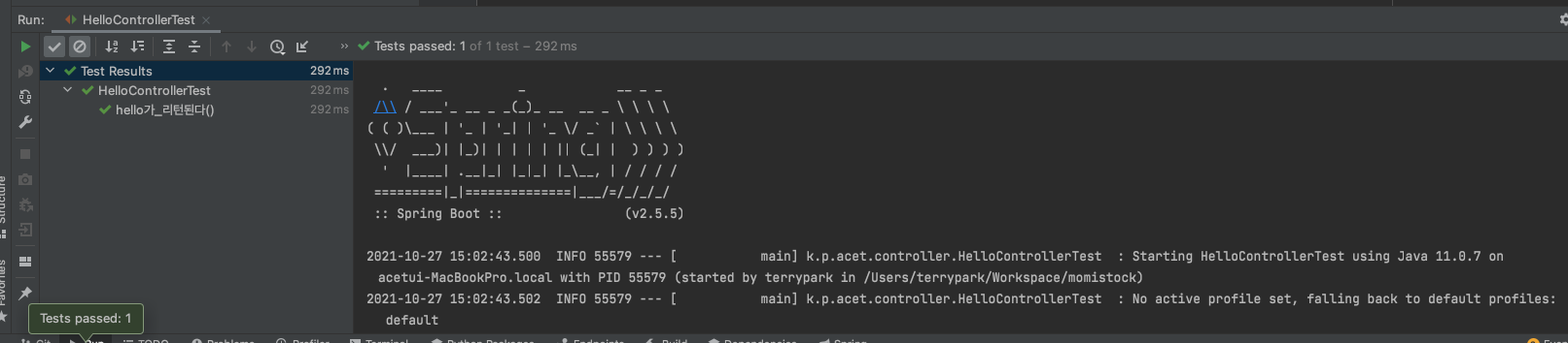 테스트코드에서 String hello = "hello!"; 이렇게 수정하고 다시 돌려보겠습니다.