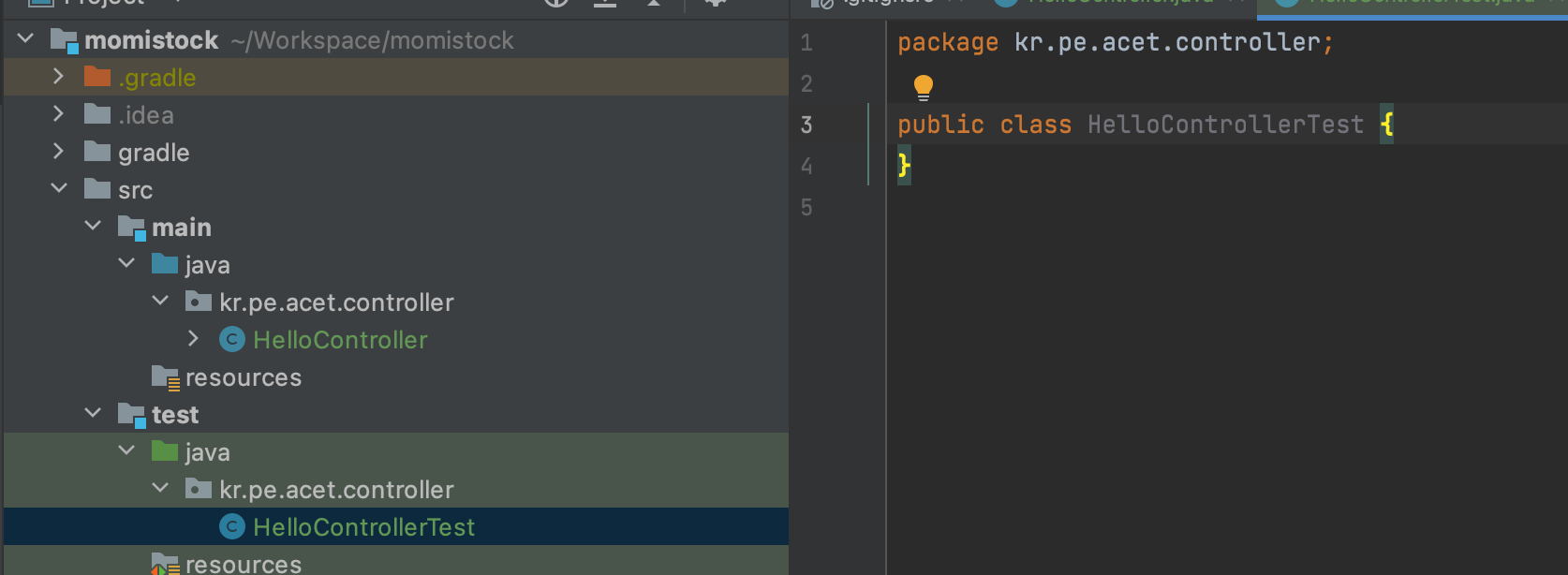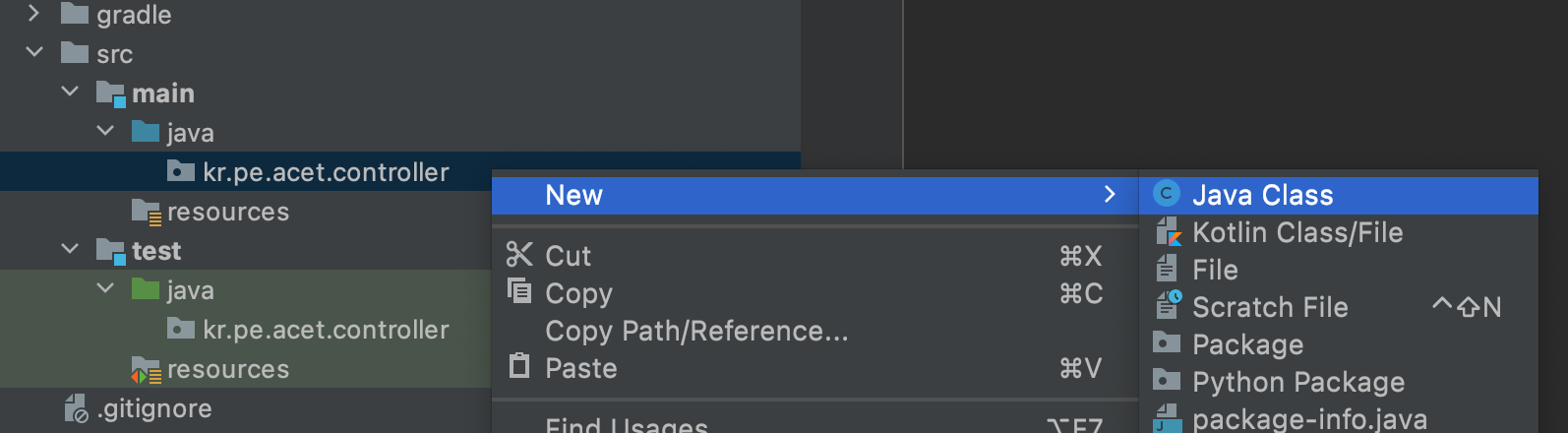 테스트코드는 뒤에 Test를 붙여서 클래스를 생성 합니다. 패키지는 메인쪽과 동일합니다.