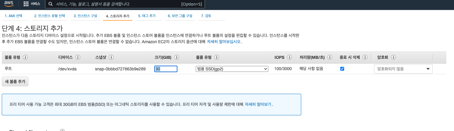 다음은 스토리지 인데 최대치인 30GB로 변경 해줍니다. 더 높게 잡으면 비용이 청구가 됩니다! ㅋㅋ