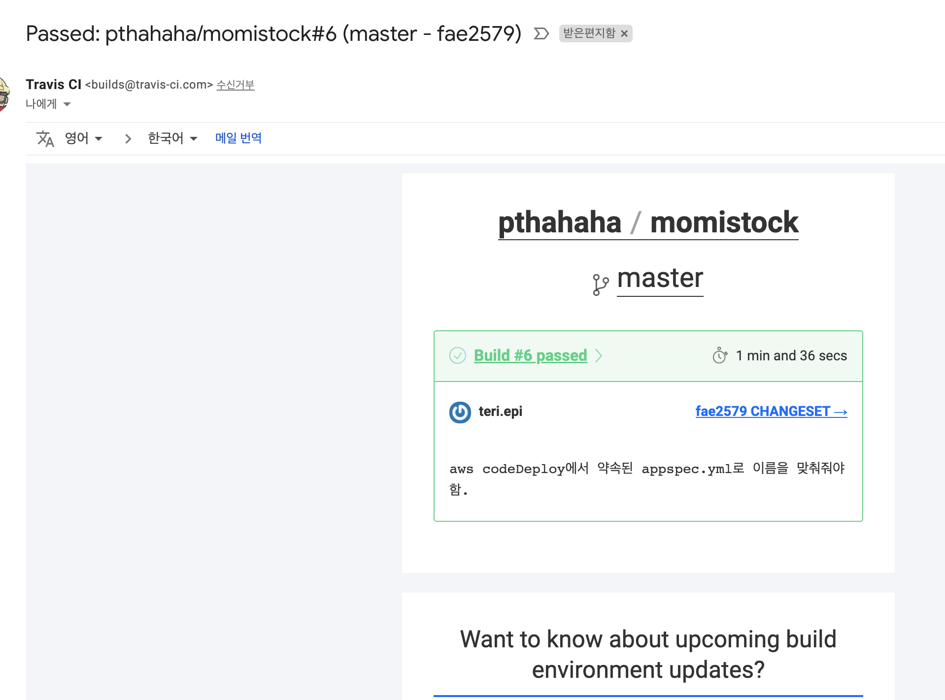 master branch에 커밋&푸쉬를 하고 좀 전의 Travis CI 저장소 페이지를 확인해 봅니다.