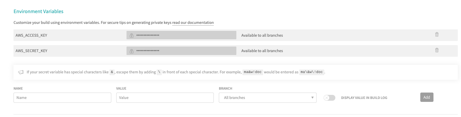 우리는 Environment Variables에 AWS_ACCESS_KEY, AWS_SECRET_KEY를 변수로 해서 IAM에서 발급받은 키를 등록 합니다.