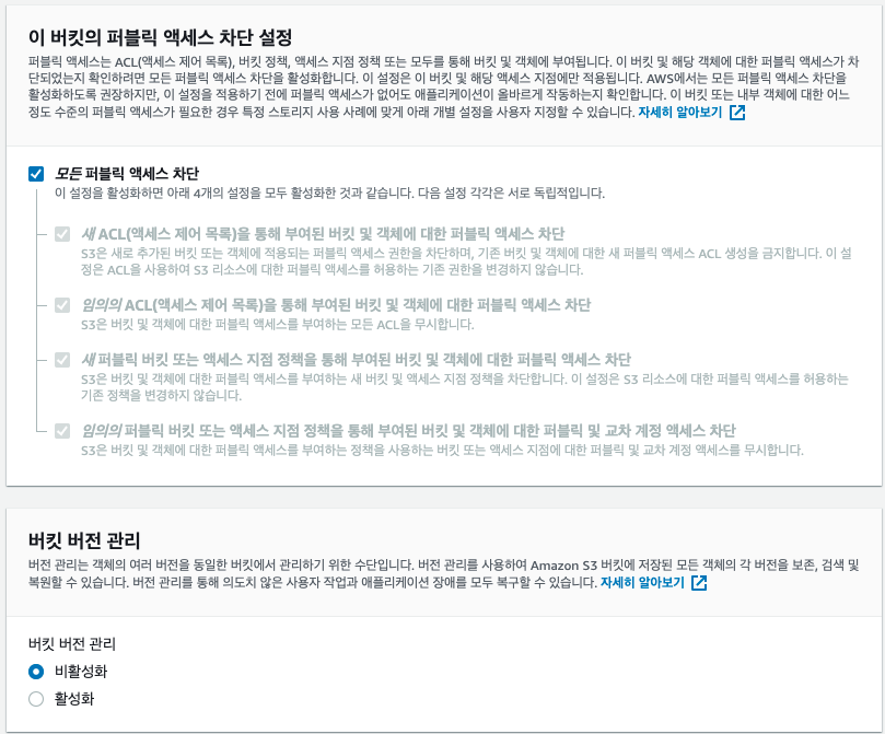 버킷 버전관리는 하면 좋겠지만..용량이 늘어나고 용량이 늘어나면 돈으로 직결되니 여기서는 비활성화를 해줍니다 ㅋㅋ