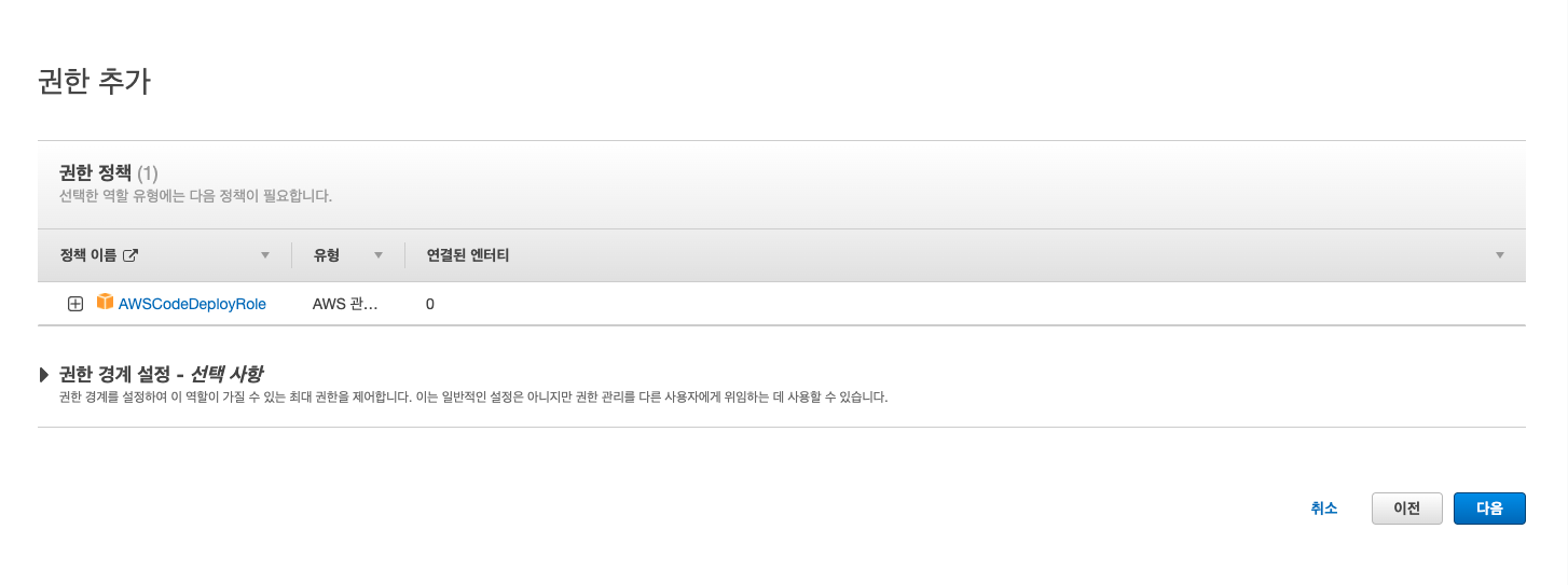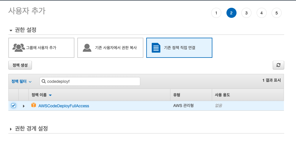 권한 설정은 기존 정책 직접연결을 선택하고 아래와 같이 S3, CodeDeploy를 선택하고 넘어갑니다.