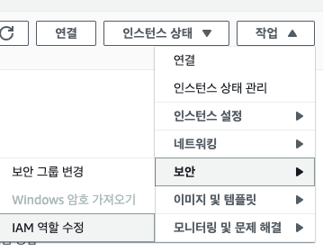 EC2 인스턴스 목록으로 이동하여 보안 > IAM 역할 수정을 클릭 합니다.