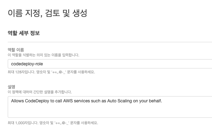 배포설정에 배포구성은 한번 배포할때 몇 대의 서버에 배포할지를 결정하는데 2대 이상이라면 1대씩 배포할지, 30% 혹은 50%로 나눠서 배포할지 등등 여러 옵션을 선택하는게 있는데 여기서는 1대이기때문에 전체배포 옵션(CodeDeployDefault.AllAtOnce)을 선택 합니다.
