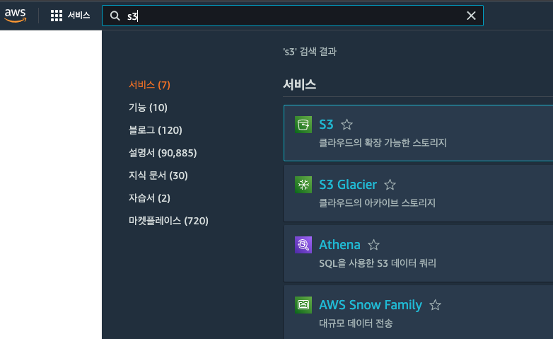 역시나 AWS 콘솔에서 s3를 검색 합니다.