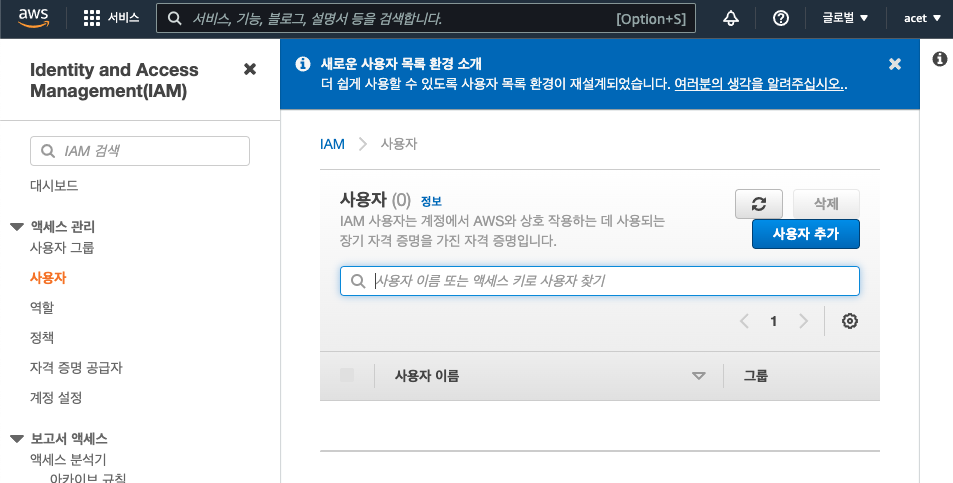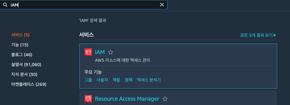 위처럼 AWS 웹콘솔에서 IAM을 검색하여 클릭 해줍니다.