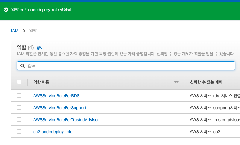 아래와 같이 codeploy-role이라는것이 생성 되었습니다. codedeploy to ec2