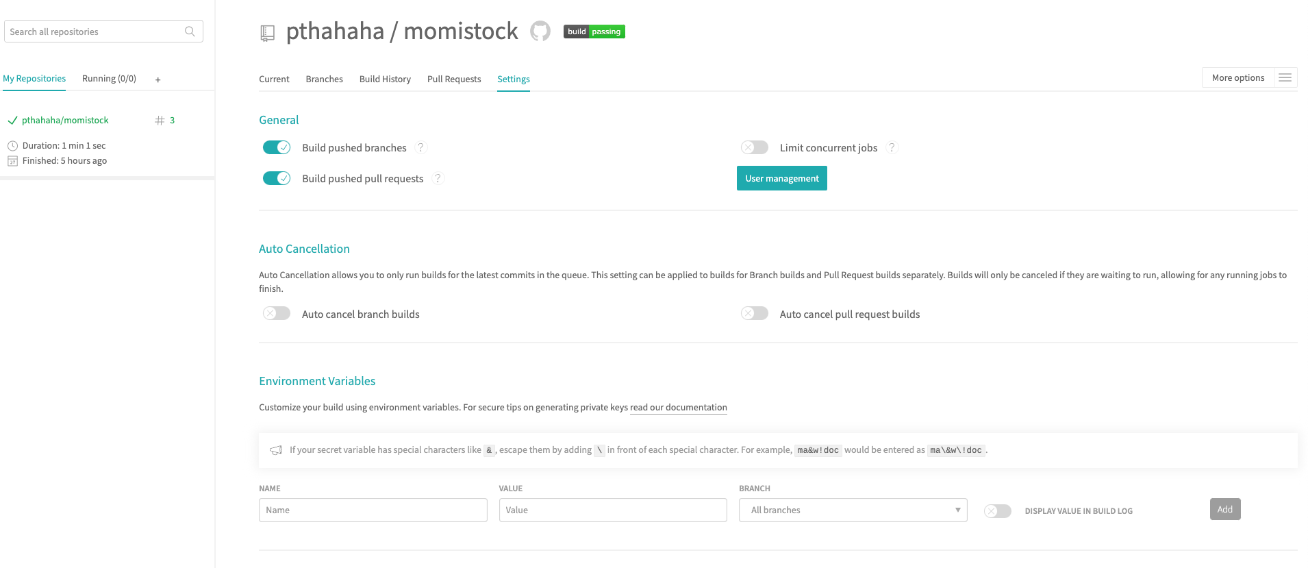 Travis CI로 가서 More options > Settings를 클릭 합니다.