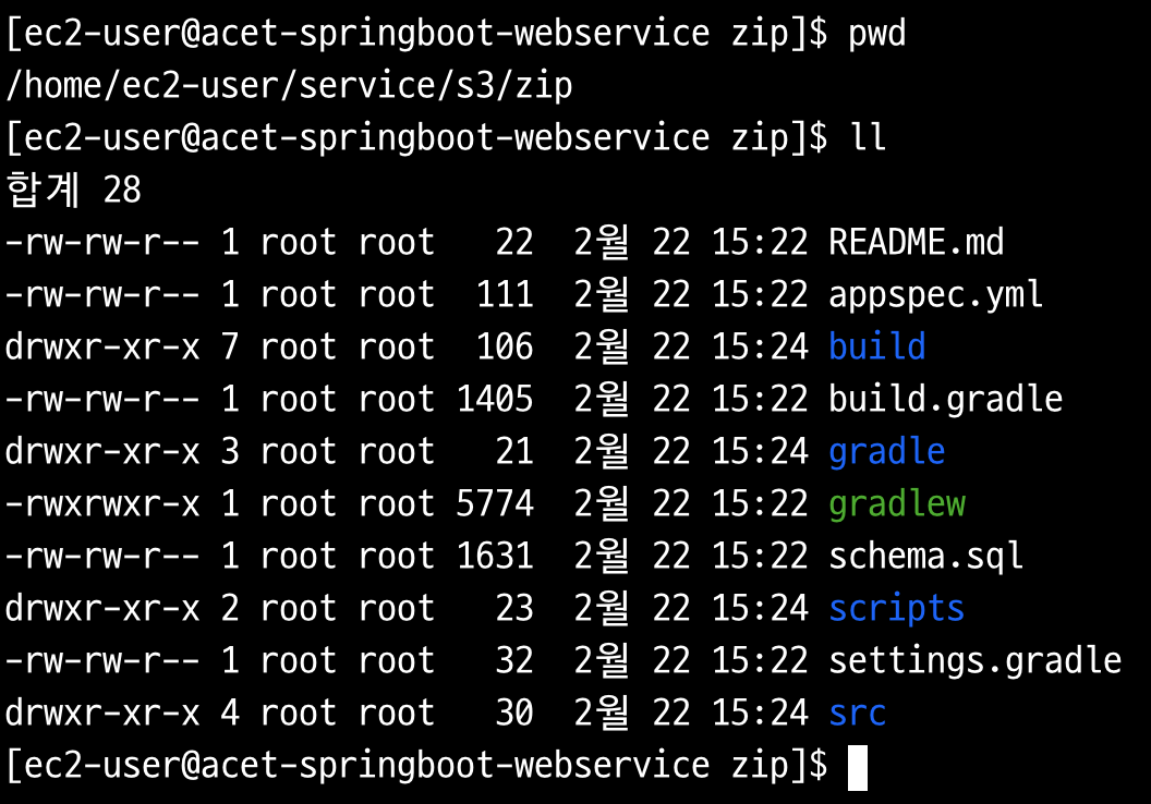 마지막으로 EC2서버에 접속하여 파일들이 잘 배포되었는지 확인 합니다.