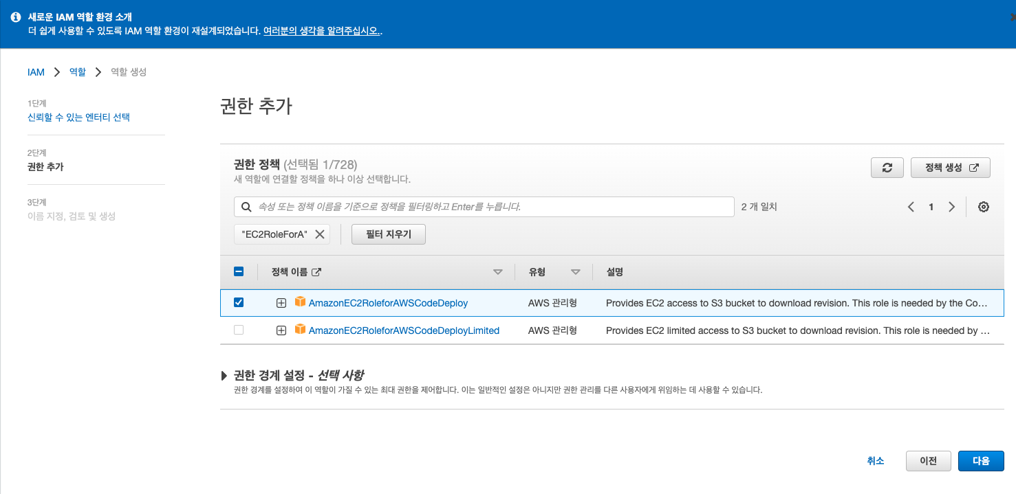 권한 추가는 EC2RoleForA로 검색하여 아래와 같이 AmazonEC2RoleforAWSCodeDeploy를 선택 하고 다음을 누릅니다.
