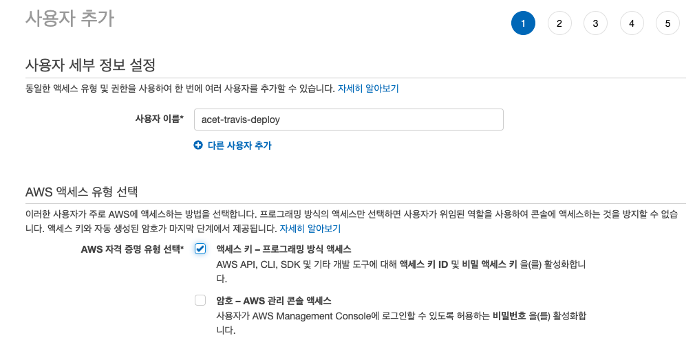 사용자 이름을 넣고 AWS 액세스 유형은 프로그래밍 방식 액세스를 골라 줍니다.