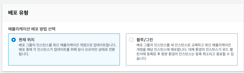 배포유형은 배포할 서비스가 2대 이상이면 블루/그린을 선택하고 현재는 1대의 EC2에만 배포하기 때문에 현재 위치를 선택 합니다.