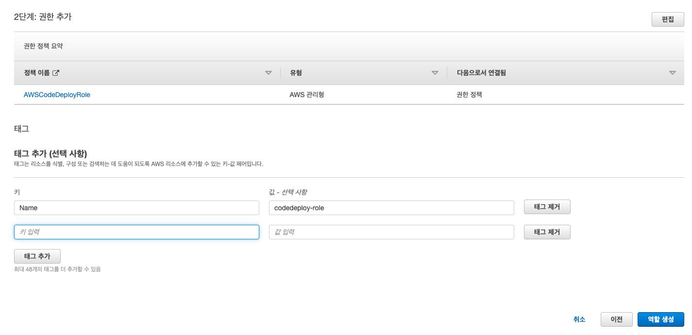 배포설정에 배포구성은 한번 배포할때 몇 대의 서버에 배포할지를 결정하는데 2대 이상이라면 1대씩 배포할지, 30% 혹은 50%로 나눠서 배포할지 등등 여러 옵션을 선택하는게 있는데 여기서는 1대이기때문에 전체배포 옵션(CodeDeployDefault.AllAtOnce)을 선택 합니다.