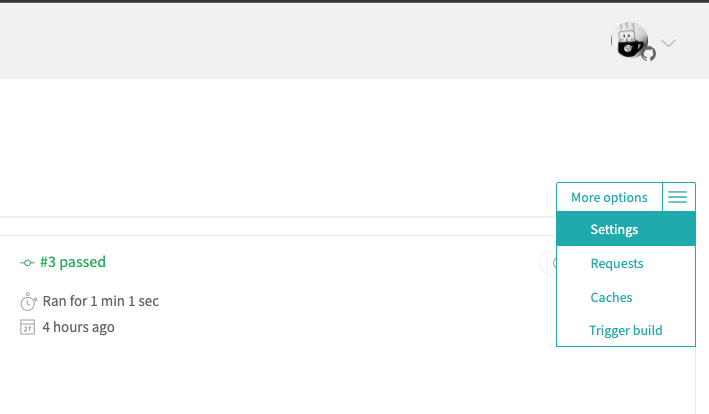 Travis CI로 가서 More options > Settings를 클릭 합니다.