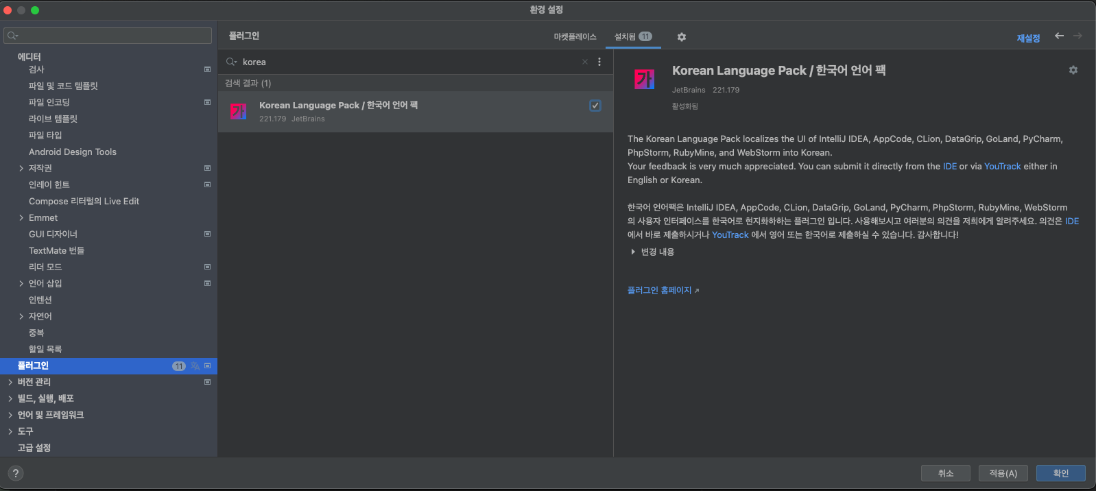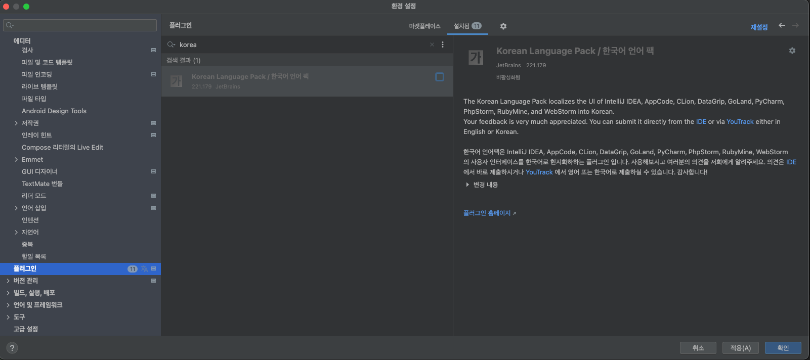 저 처럼 영어가 더 편해진 분들은 아래와 같이 플러그인에서 한글언어패치 플러그인을 삭제 해주시면 됩니다.