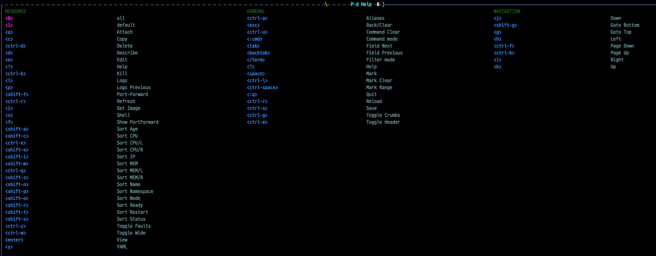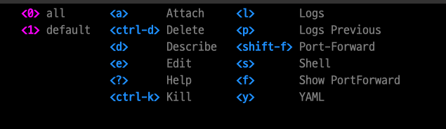 그리고 ? 누르면 k9s에서 사용가능한 전체 단축기들이 나온다.