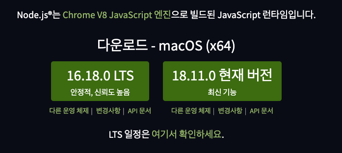 그래서 https://nodejs.org/ko/ 에 가서 LTS버전과 최신버전 중! 고민없이 최신버전으로 업데이트를 해주었습니다.