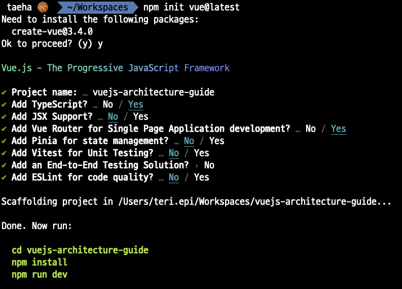 npm init vue@latest : Need to install the following packages : create-vue@3.4.0