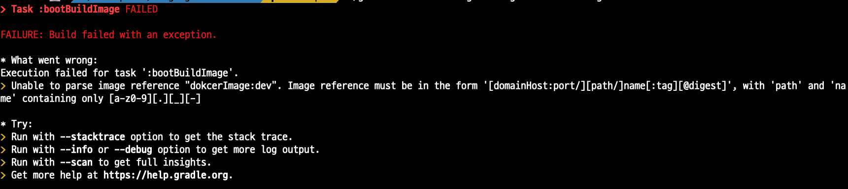 다시 돌아와서 아래처럼 ./gradlew bootBuildImage --imageName=dokcerImage:dev 명령어에 대한 fail에 대한 오류를 봤더니
