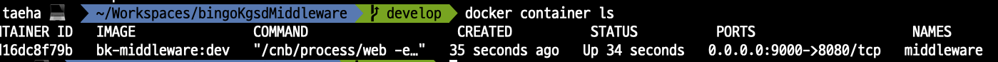 docker container ls 를 해보면 아래와 같습니다. -p에서 노출할 포트가 9000 / 스프링부트의 포트가 8080 입니다.