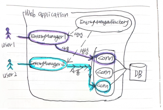 - EntityManagerFactory는 Persistence class를 가지고 JPA를 사용할 수 있게 준비를 해주는데 한번만 생성하여 공유하는게 좋습니다.
