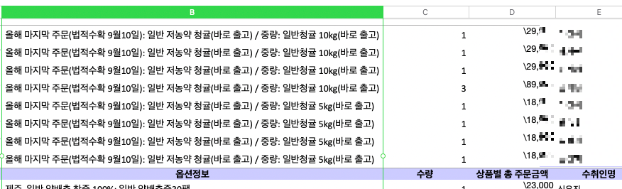 아래는 네이버스토어에서 다운받은 신규주문 엑셀!