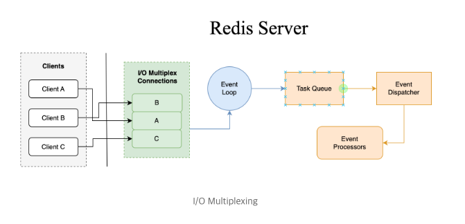1) 클라이언트 : A,B,C 클라이언트가 동시에 Redis 서버에 요청을 보냅니다.(NoN-Blocking I/O)