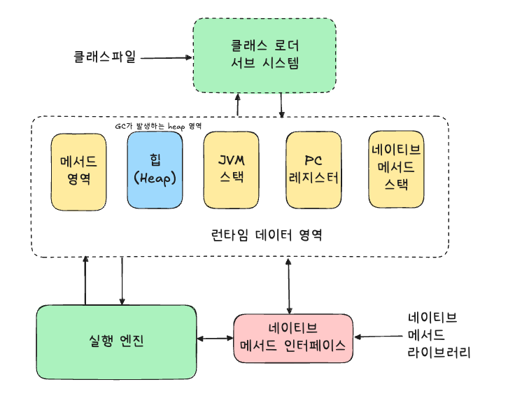 클래스로더가 컴파일 된 바이트코드를 메모리에 올리고 실행엔진이 그 바이트코드를 실제로 돌리는 구조 입니다.
