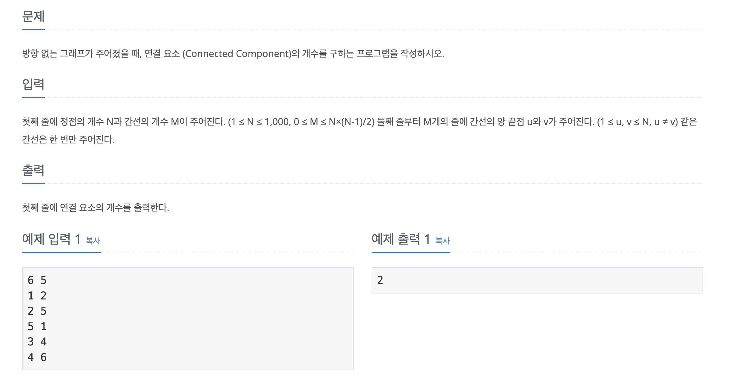 input : 첫번째 줄에 정점의 개수 N과 간선의 개수 M / 두번째 줄부터는 M개의 줄에 간선의 양 끝점 u와 v가 주어진다.