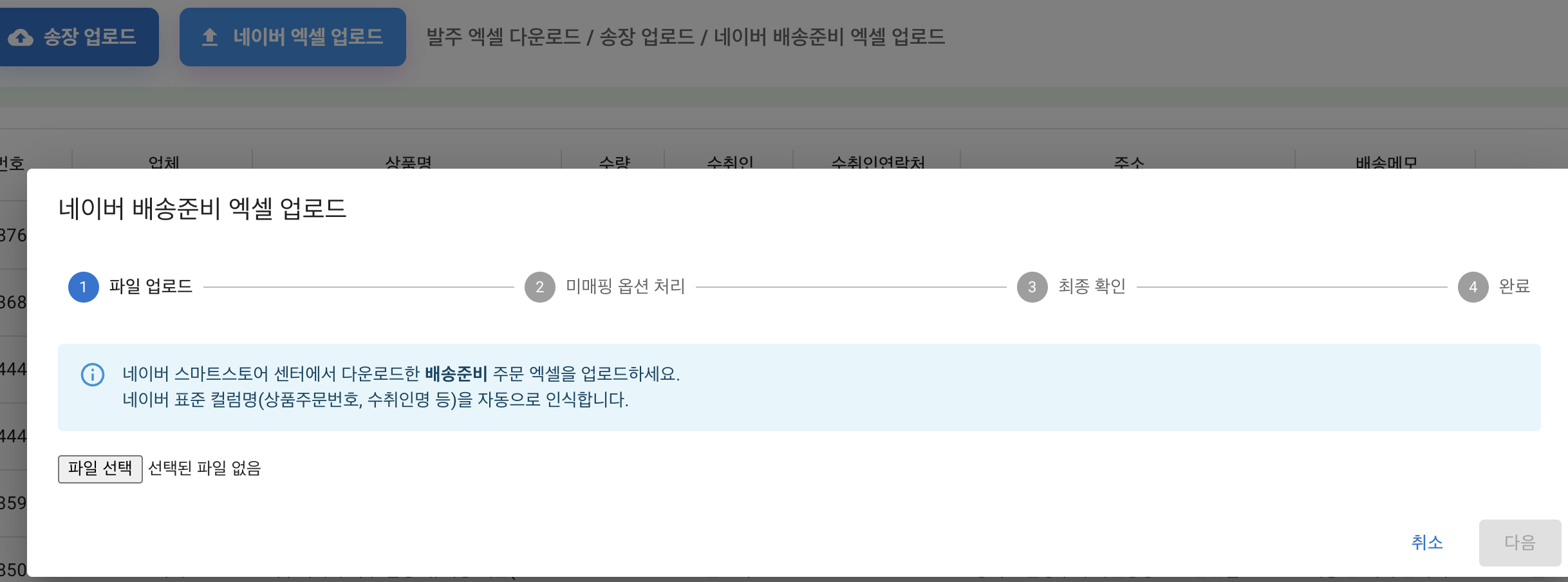 요 기능은 신규주문 또는 네이버스토어 주문 엑셀을 통해서 처리하기 위함이다.