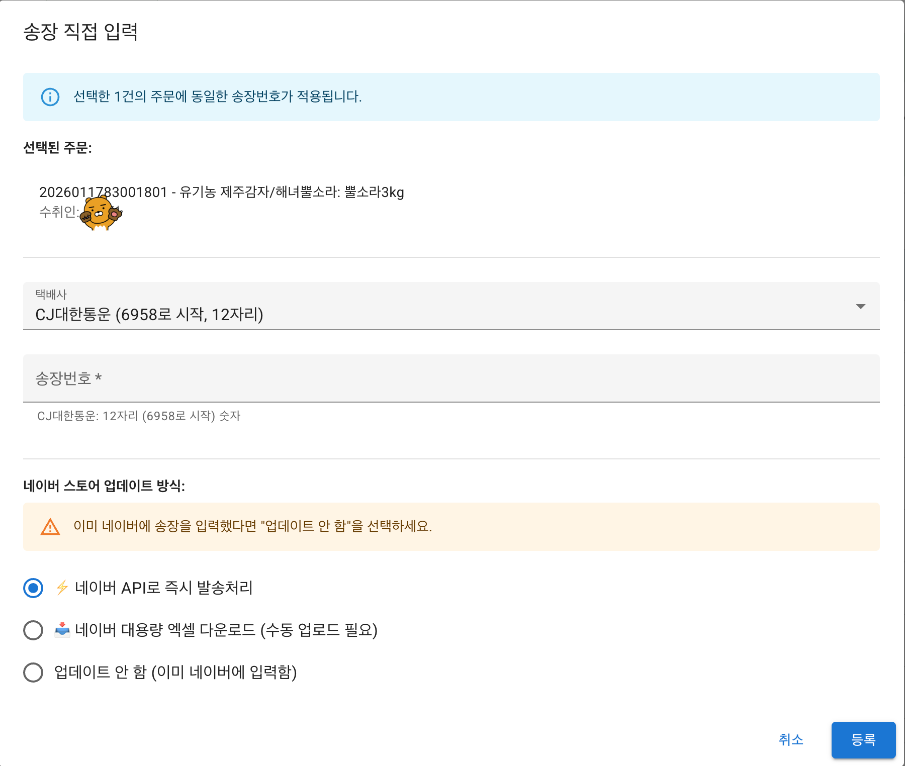 그리고 직접 송장번호를 넣고 싶어한다면?