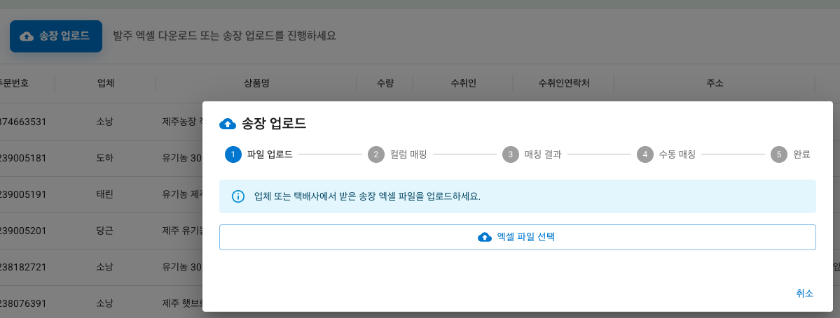 우선 택배사에서 준 엑셀파일을 선택해서 업로드 한다.